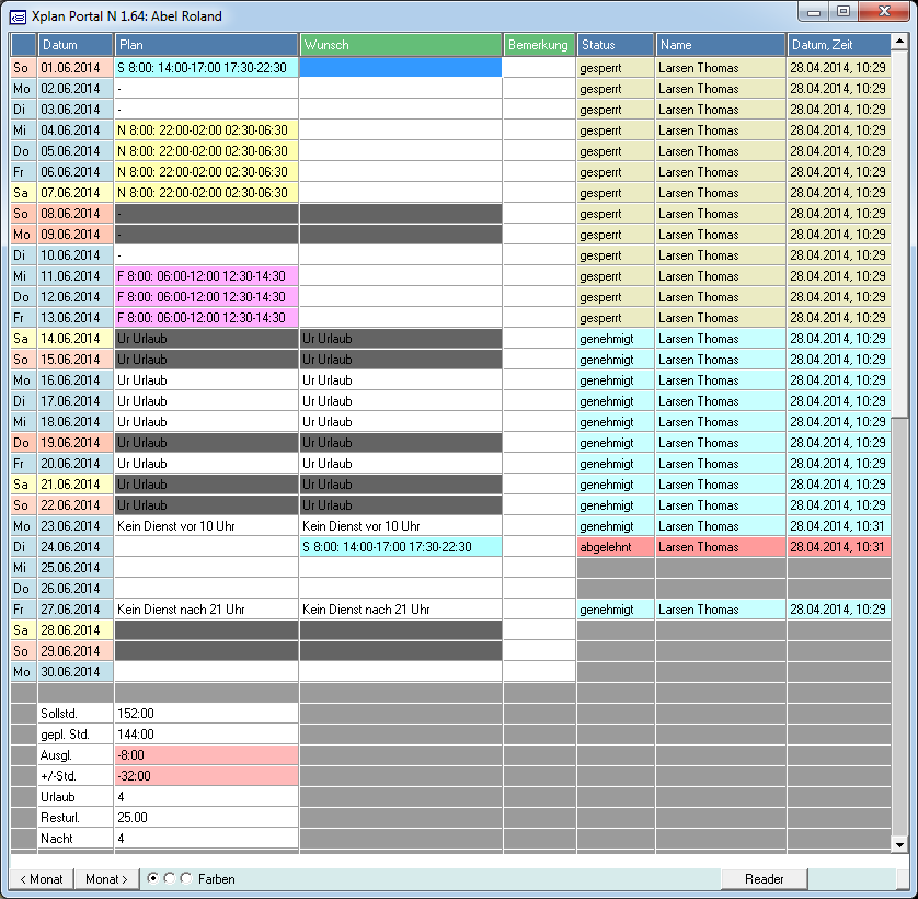 Wunschdienste und Wunschfehltage werden im Sollplan durch gelbe Schrift gekennzeichnet.
